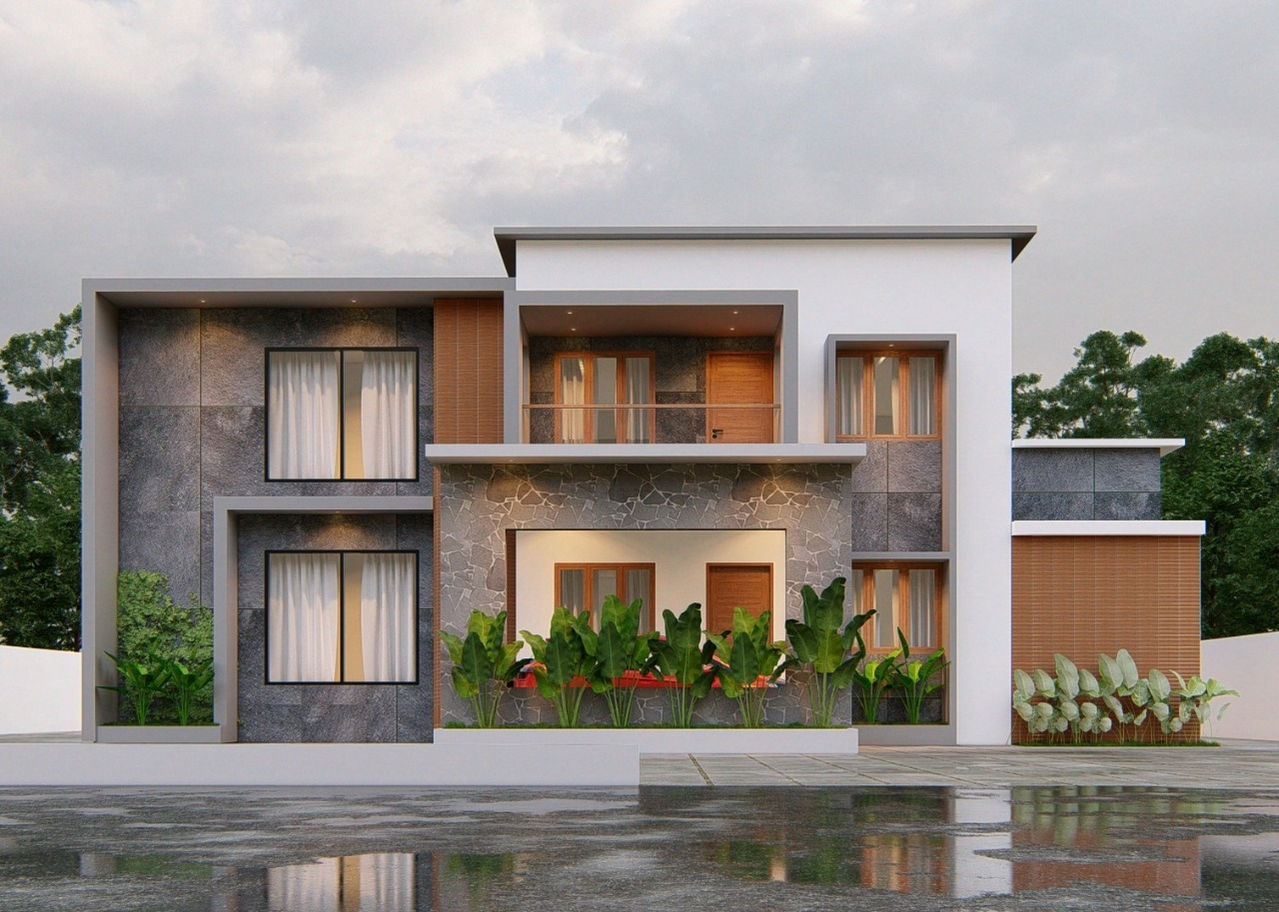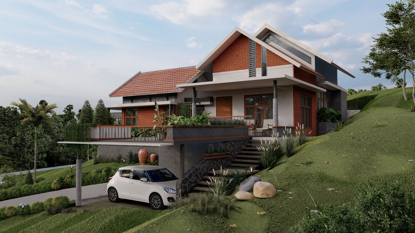 Located in Pulpally, Wayanad, this tropical-style residence blends contemporary design with natural elements. The single-story home features a flat and sloped roof combination, clean lines, and earthy tones, creating a modern yet grounded aesthetic. The prominent use of stone-textured finishes and wooden details enhances its connection to the surrounding environment. Large windows allow ample natural light, while the lush landscaping at the front adds to the tropical ambiance. The symmetrical façade, with its inviting porch and seating area, provides a welcoming atmosphere for visitors.
